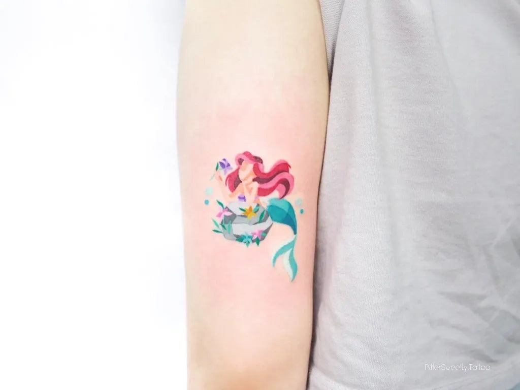 Small Neotraditional Ariel Mermaid Tattoo on Women Upper Arm by @bittersweetly.tattoo