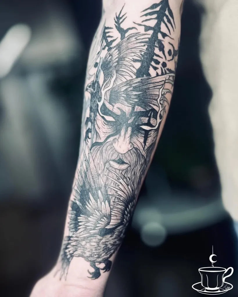 Big Viking Odin with Ravens and Trees on Men Arm Tattoo by @tattooswithtea