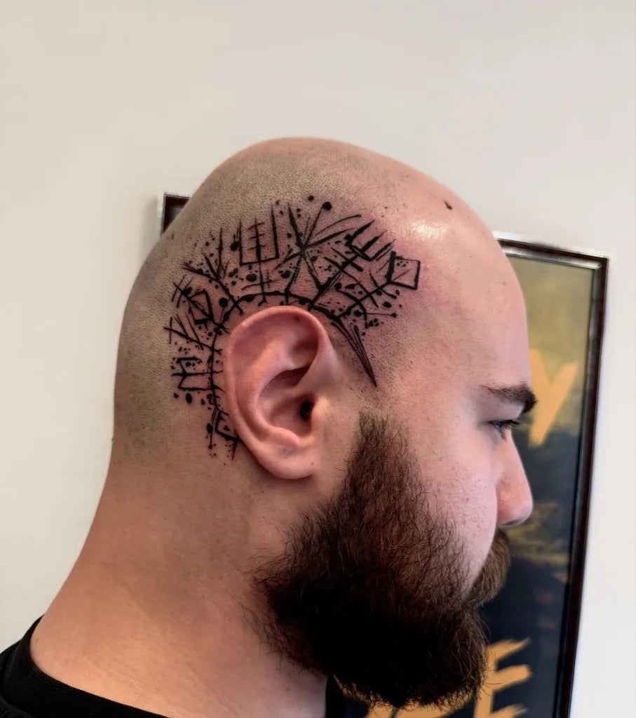 Big Viking Runes and Geometric Pattern on Men Head Tattoo by @onurturhantattoo
