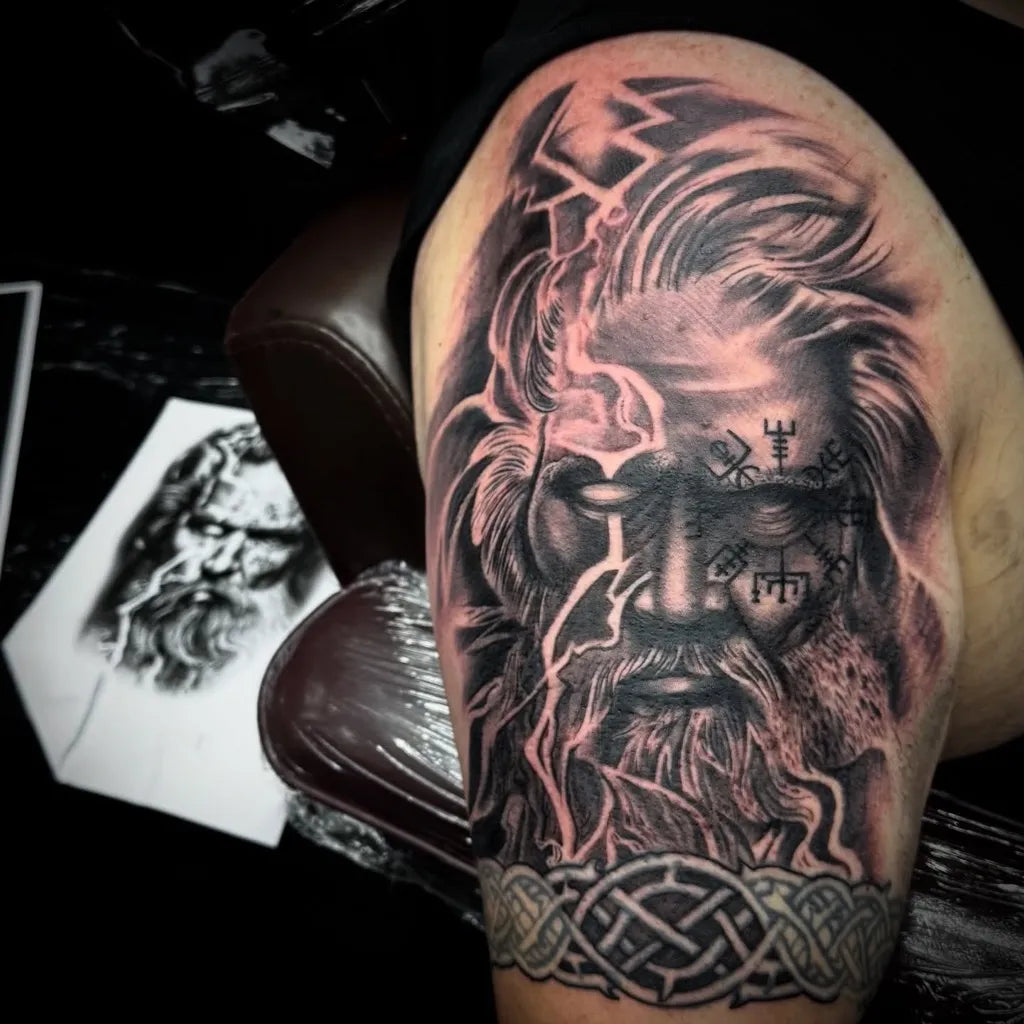 Big Viking Odin vegvisir bearded face on Men Shoulder Tattoo by @antbatetattoos