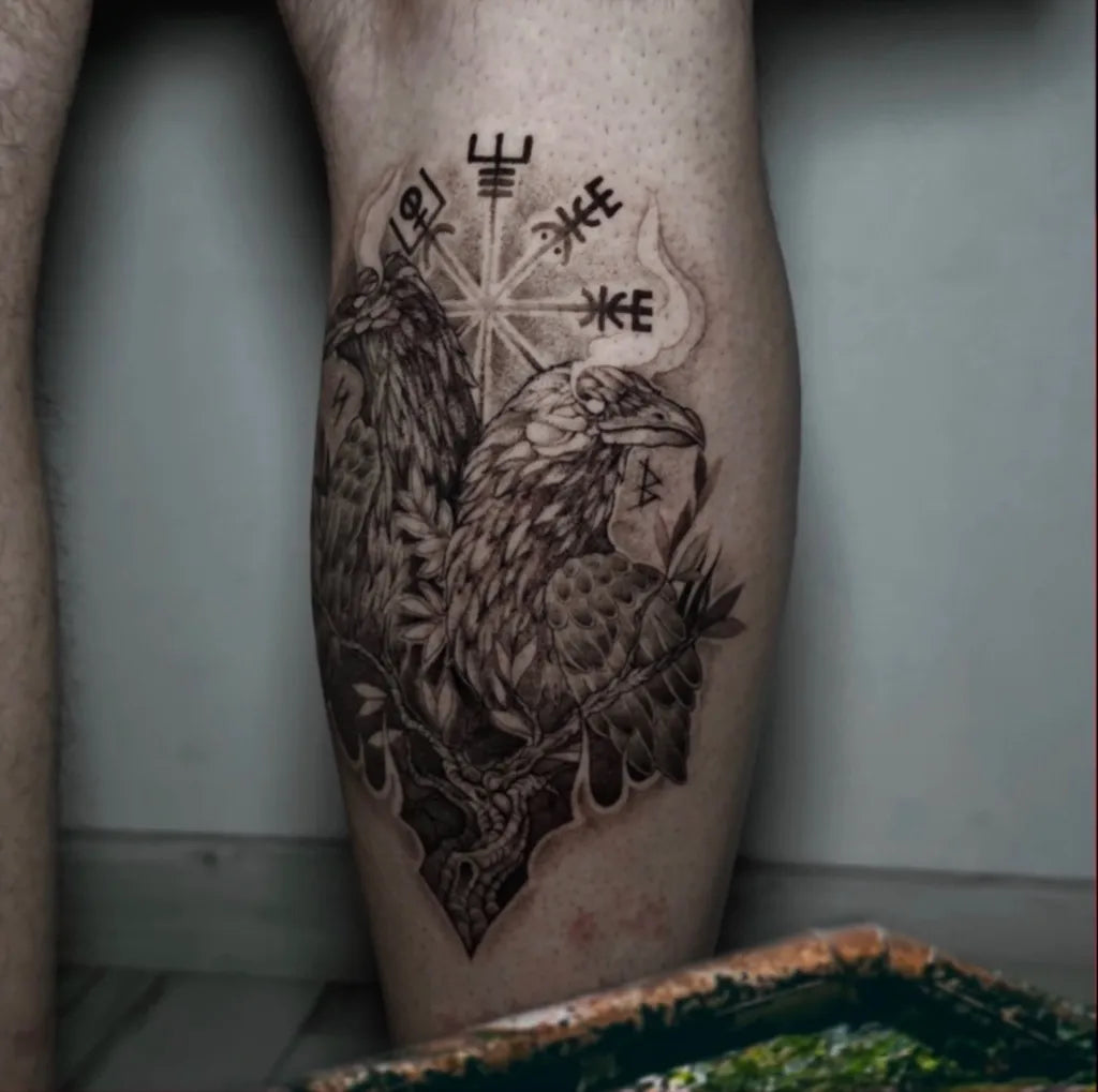 Big Viking Vegvisir Ravens on Men Leg Tattoo by @xperiencevalladolid