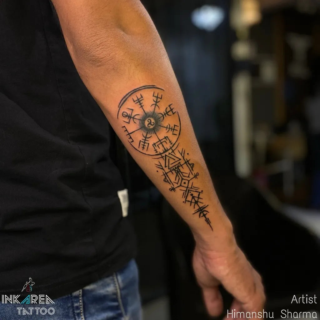 Big Viking Vegvisir and Runes on Men Arm Tattoo by @ink_area_tattoo
