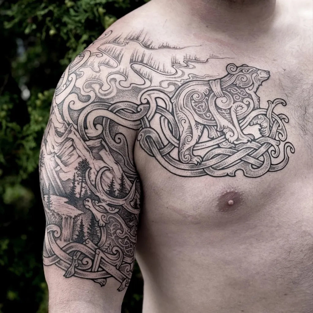 Big Viking Bear Mountains Forest on Men Arm Tattoo by @ancientwildstudios