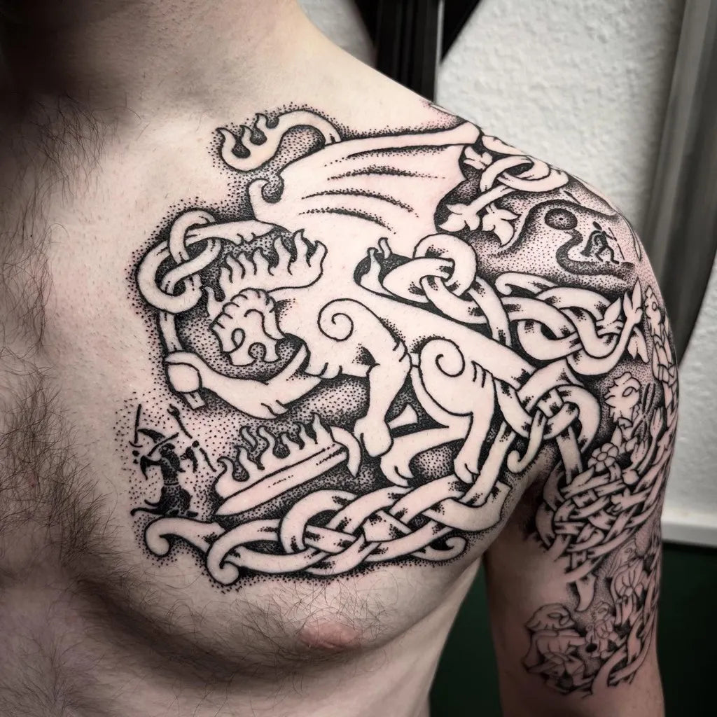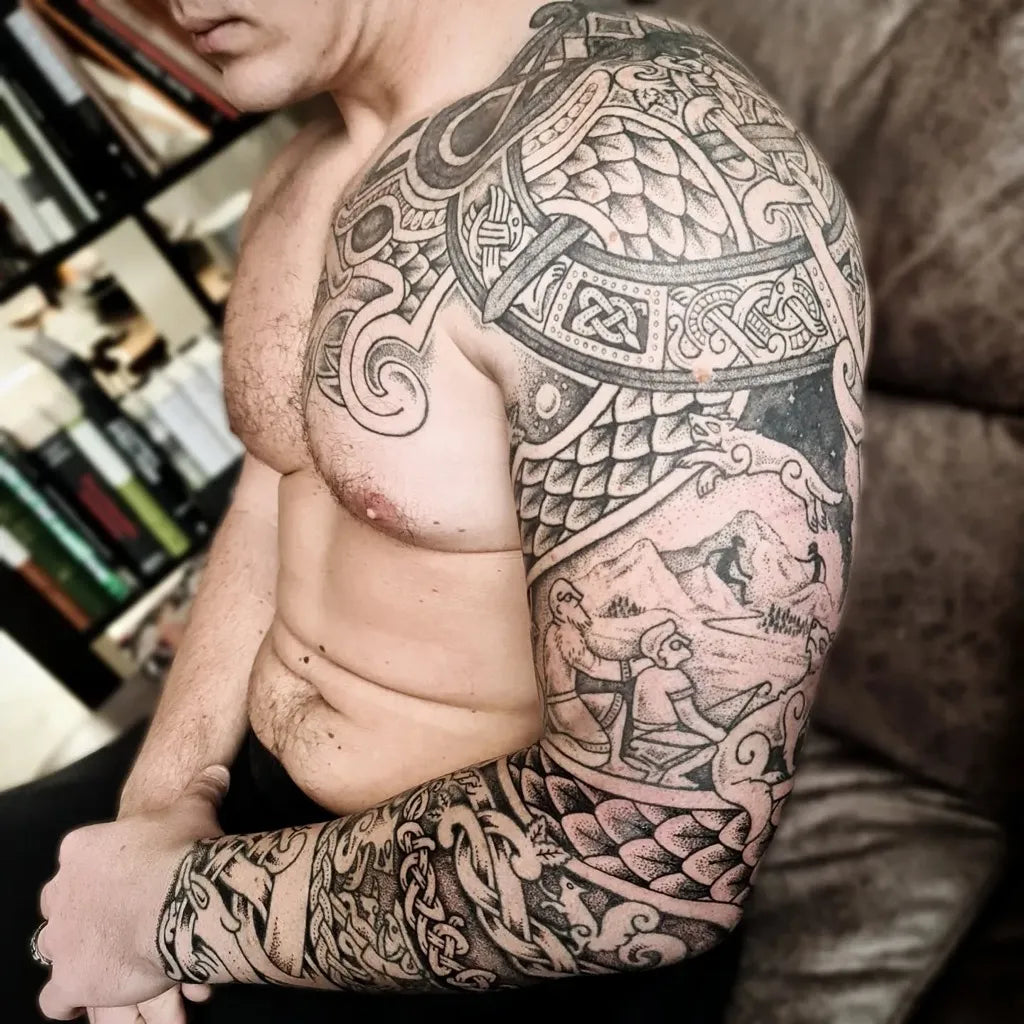 Big Viking Norse knots and dragon scales on Men Arm Tattoo by @dyrs_hjarta_art
