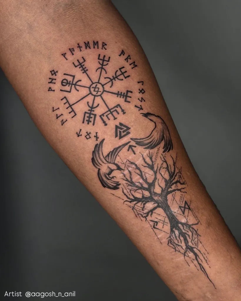 Big Viking Vegvisir Yggdrasil Ravens on Men Arm Tattoo by @n0mad_ink_tattoo