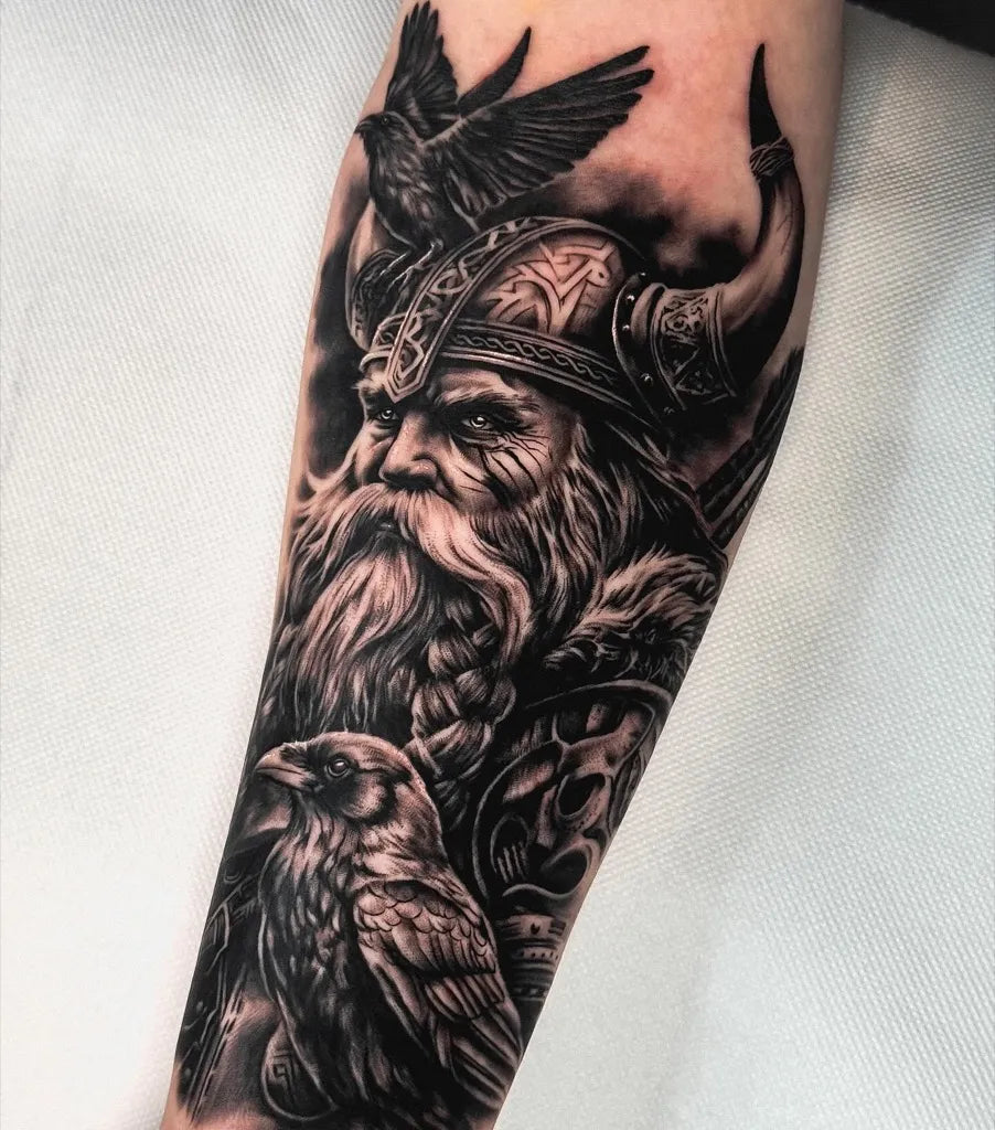 Big Viking Viking Warrior with Ravens on Men Arm Tattoo by @invictaink