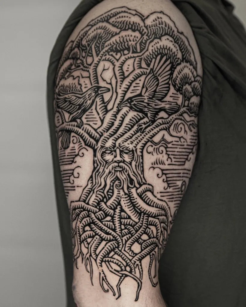 Big Viking Yggdrasil Tree with Ravens and Roots on Men Arm Tattoo by @snail_trail__