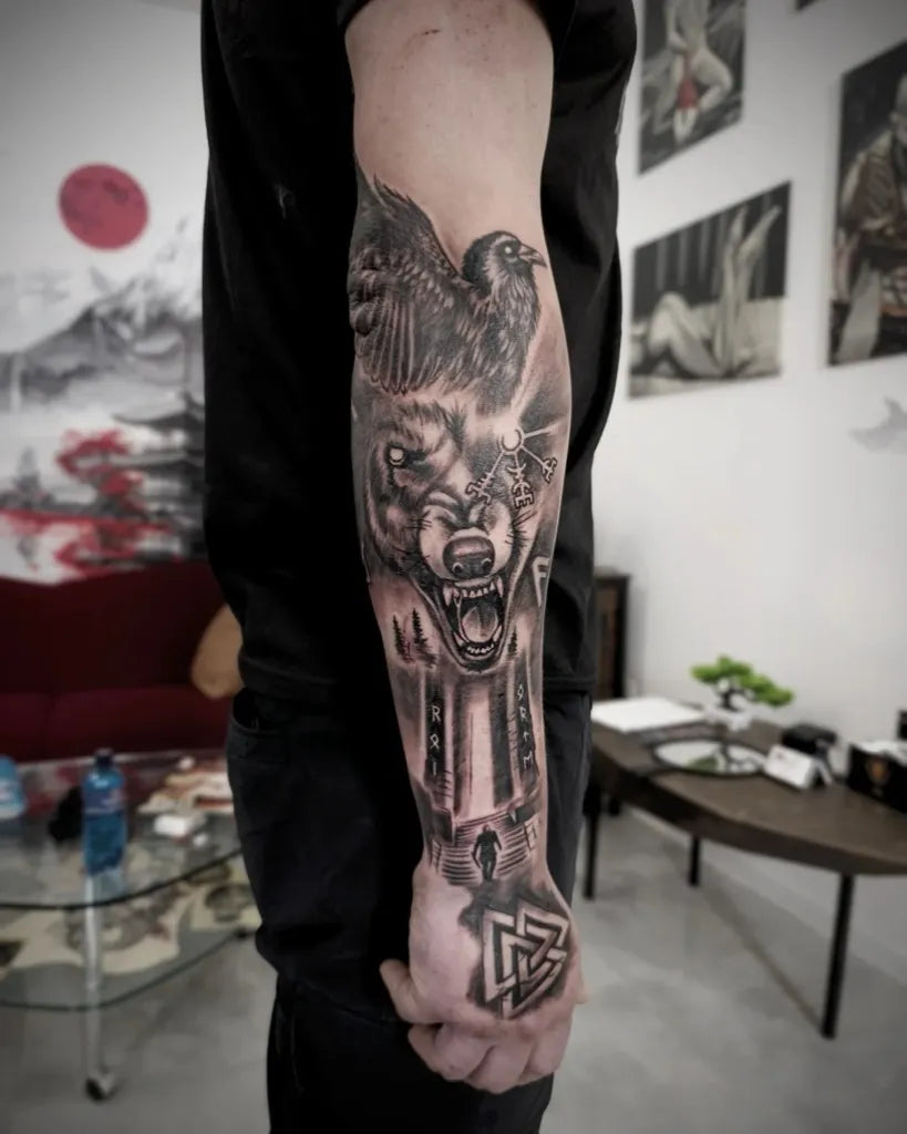 Big VikingWolf Eagle Valknut on Men Arm Tattoo by @madmike_art