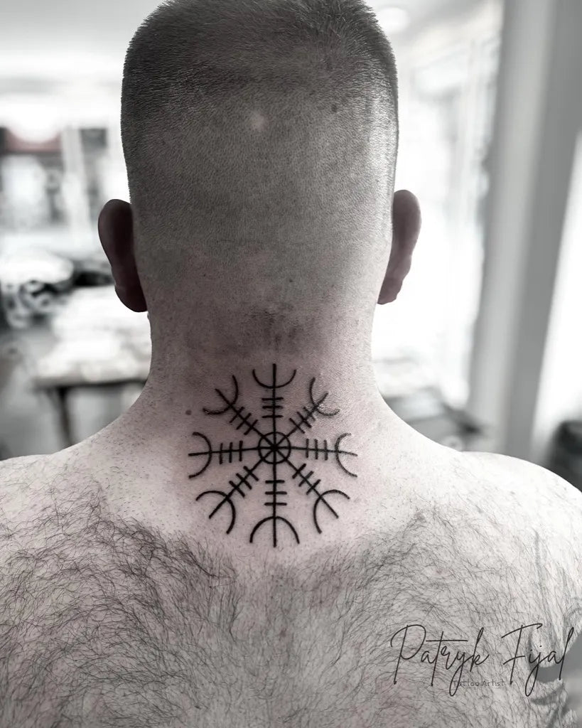 Small Viking Vegvisir on Men Neck Tattoo by @patryktatt
