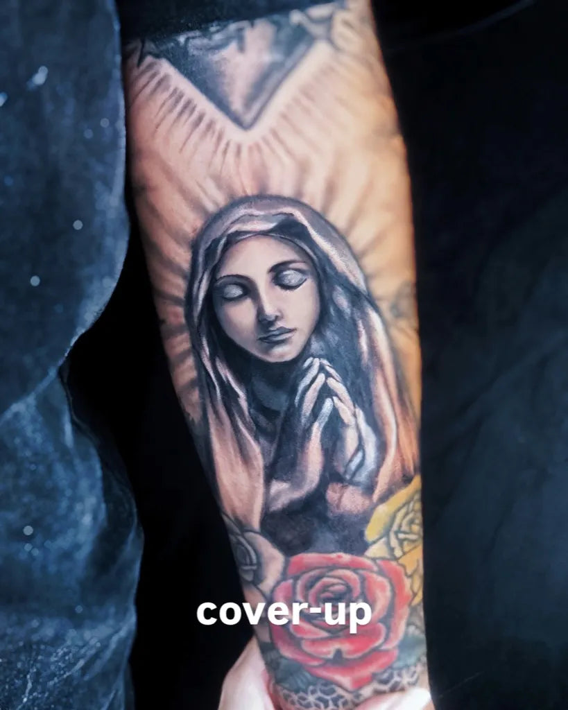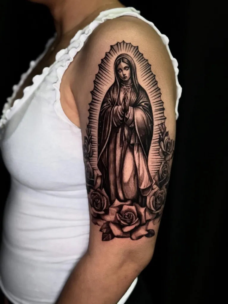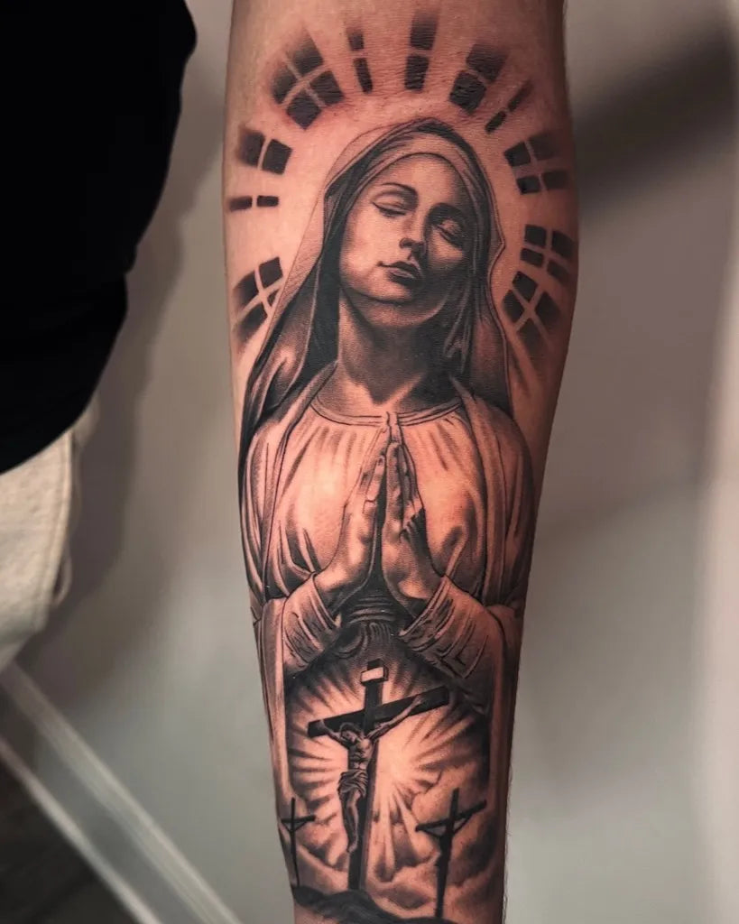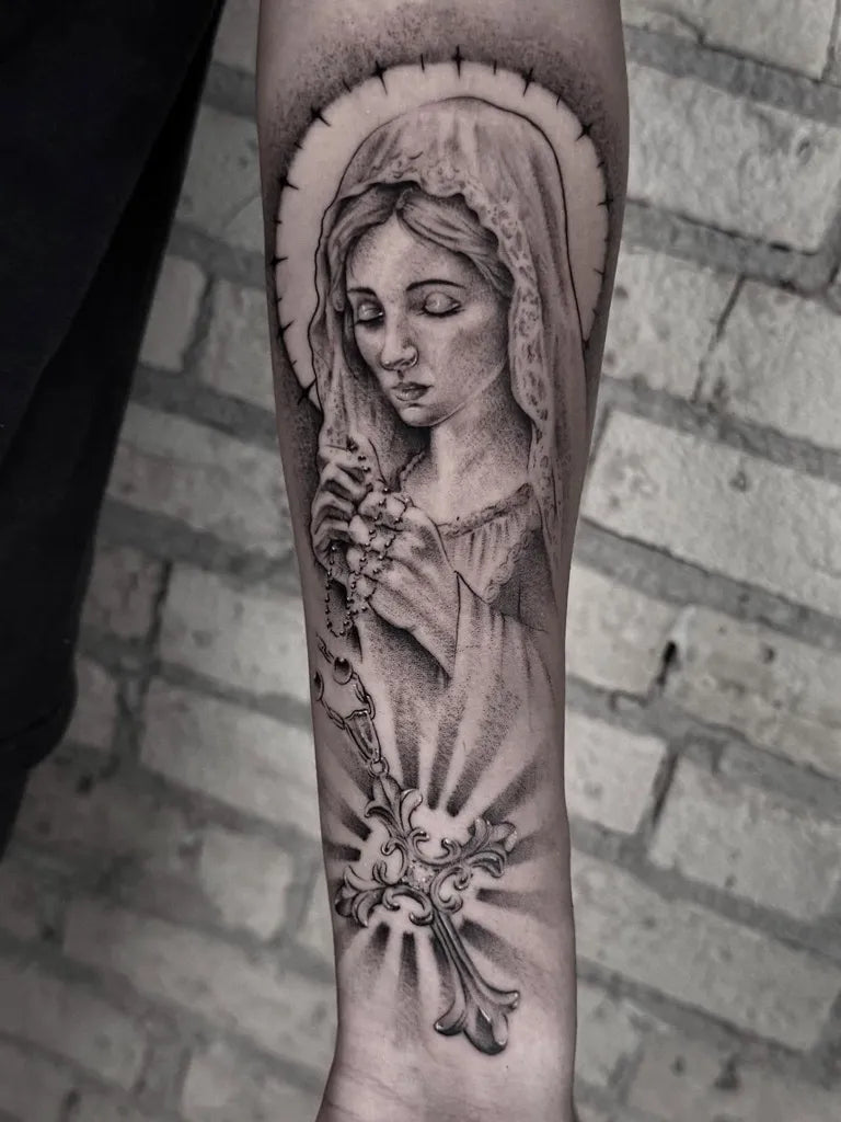 - Wrist or behind the ear: Small, subtle Virgin Mary tattoo motifs.