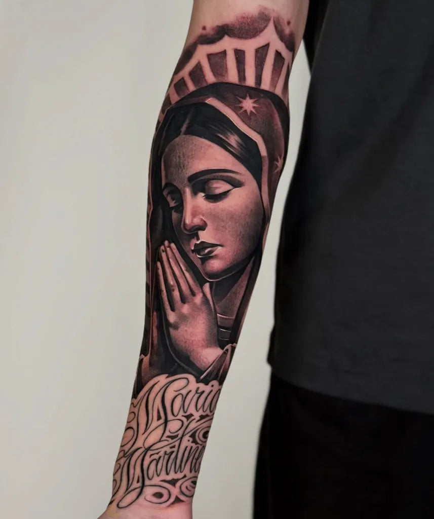 - Forearm or calf: Readable portraits with prayer hands or rosary.