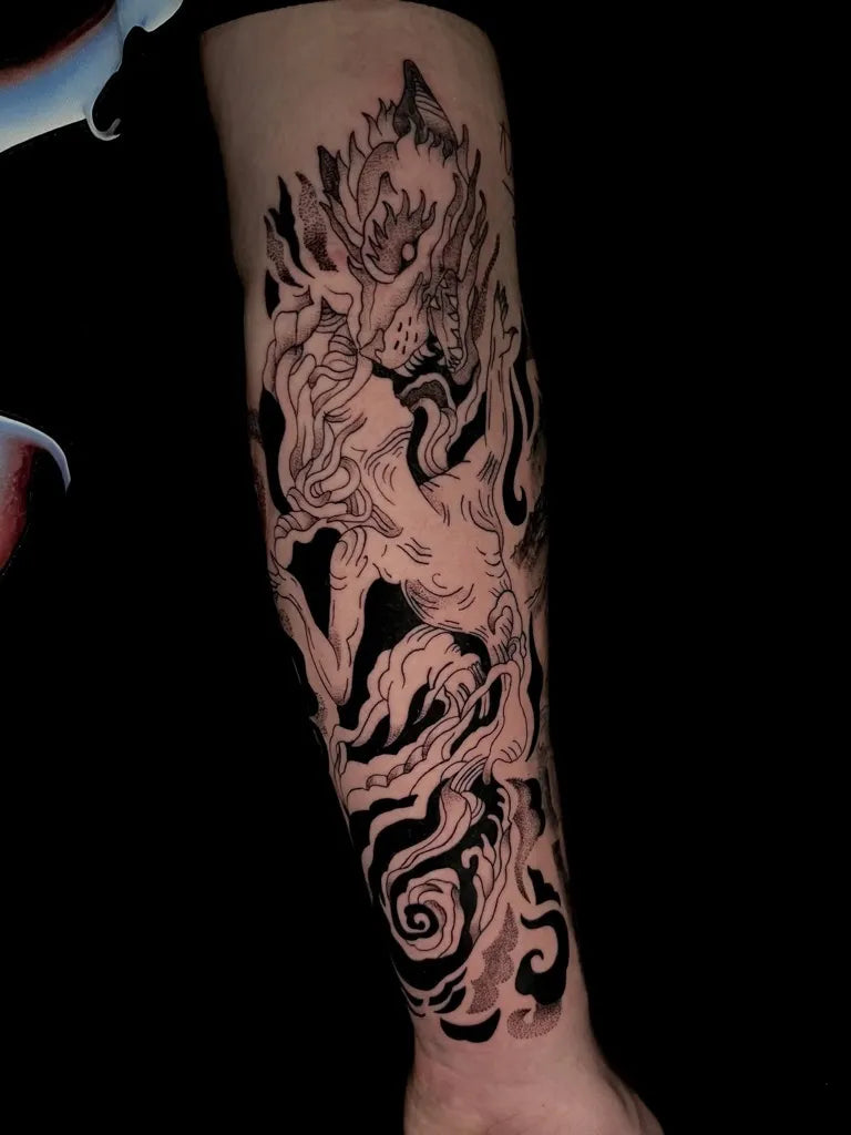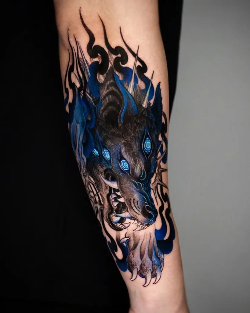 Big Black and Grey Wolf Dragon Flames on Men Arm Tattoo by @daca.tattoo