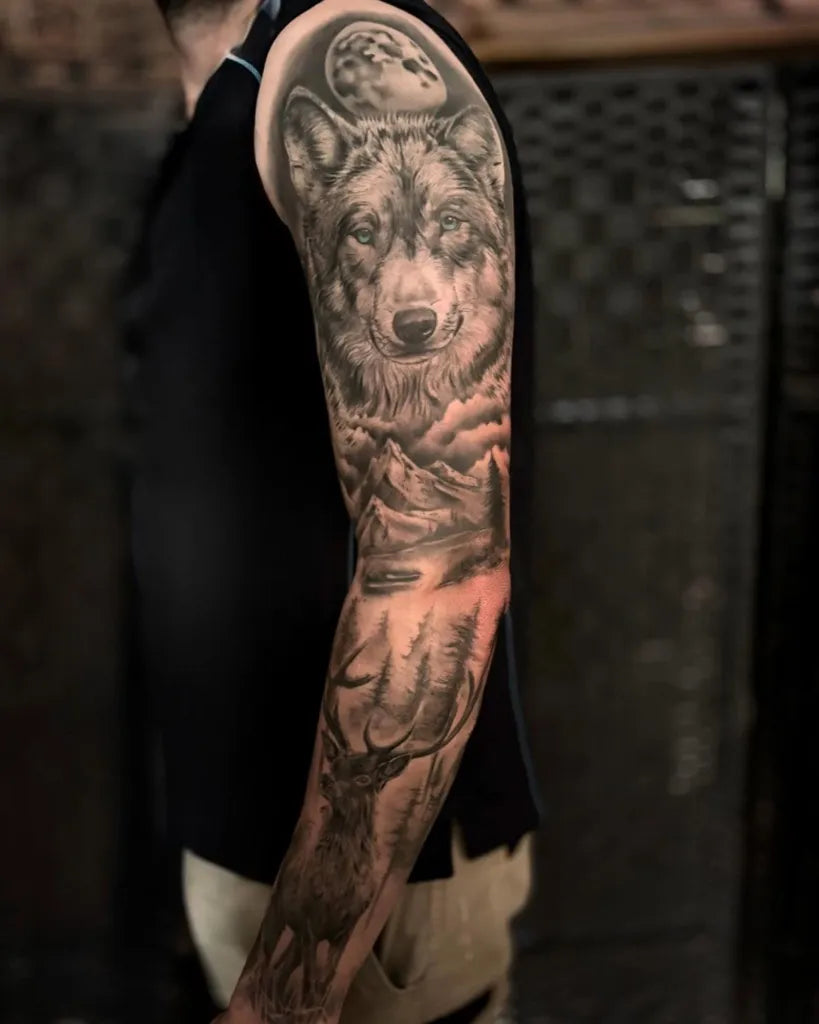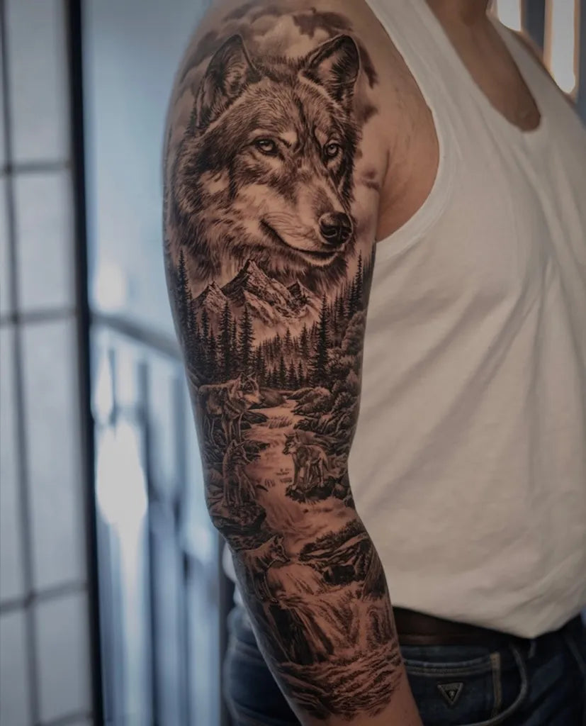 Big Black and Grey Wolf with Forest Men Arm Tattoo by @badmonkey_tattoo