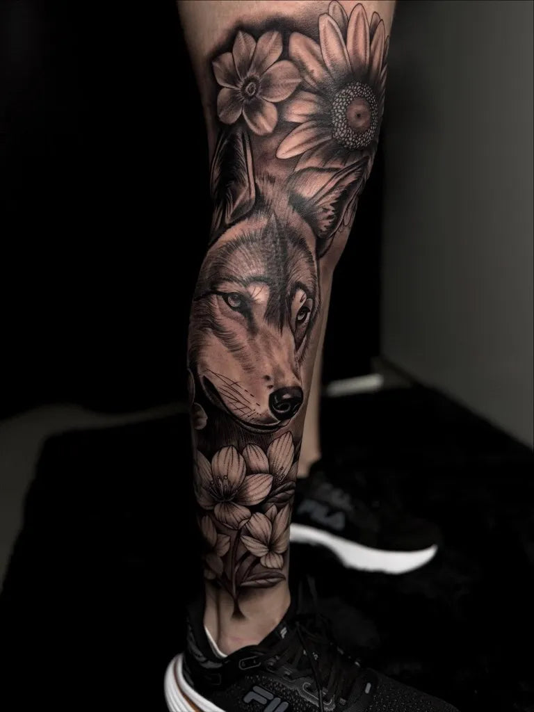 Big Black and Grey Wolf and Flowers on Women Leg Tattoo by @mikaelvitali_tattoo