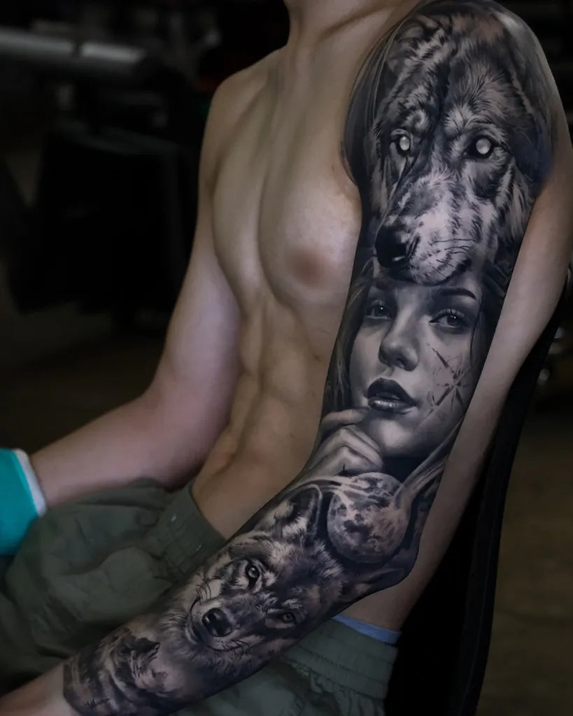 Big Black and Grey Wolf and Woman on Men Arm Tattoo by @tattoosbyiseul