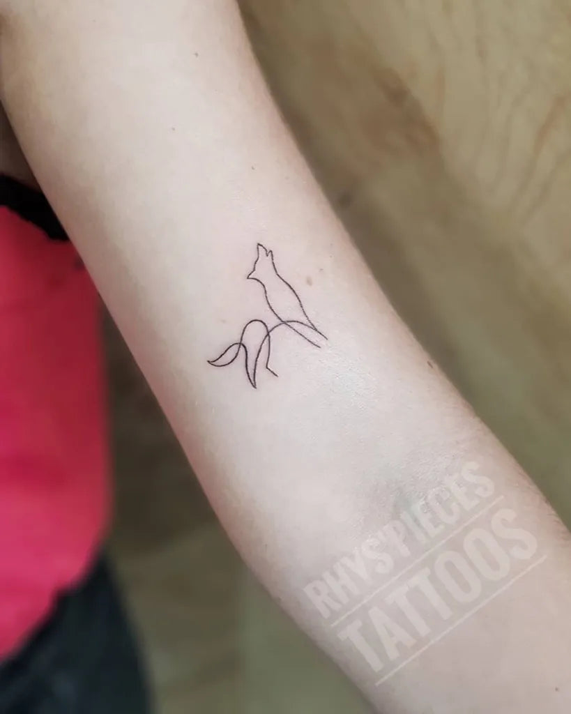 Small Linework Wolf on Women Arm Tattoo by @rhyspiecestattoos