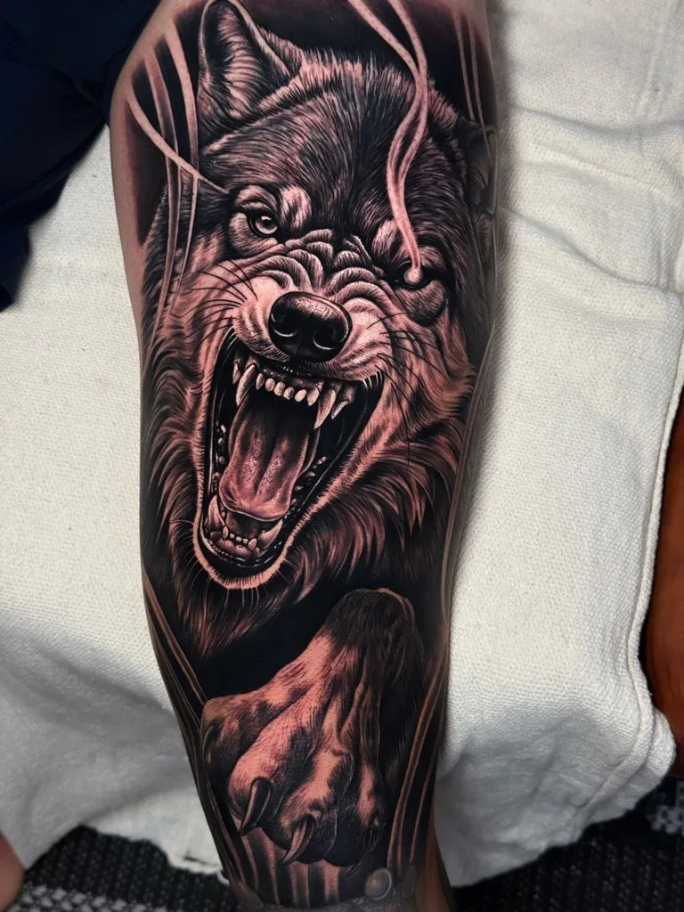 Medium Black and Grey Wolf Paw and Mountains on Men Arm Tattoo by @bronco.tattoo