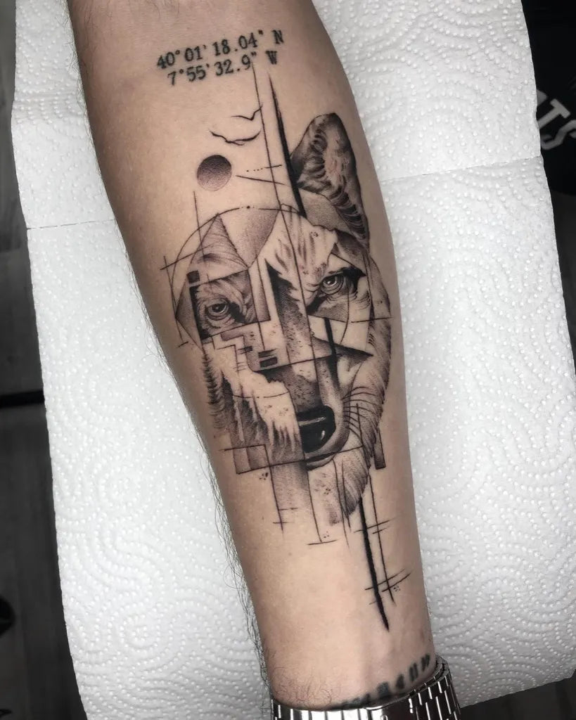 Big Geometric Wolf with Mountains and Sun on Men Leg Tattoo by @castle__tattoo
