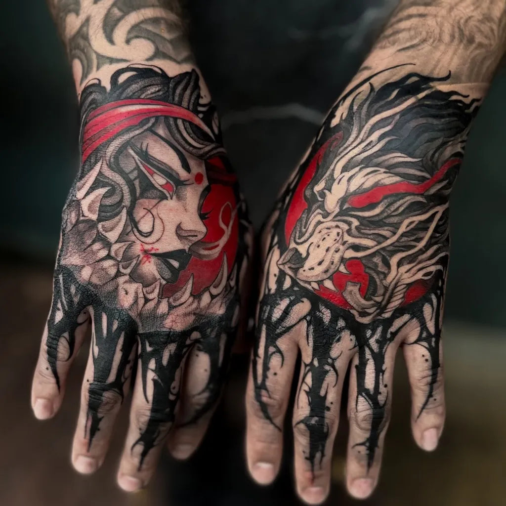Big Irezumi Wolf and Oni Woman on Men Hands Tattoo by @bocchink