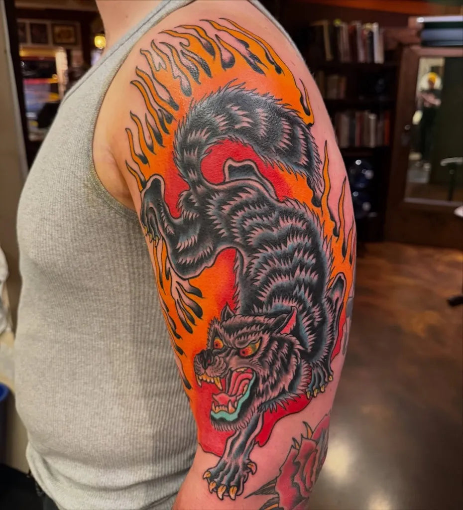 Big Neo Traditional Wolf with Flames on Men Arm Tattoo by @tberrytattoos