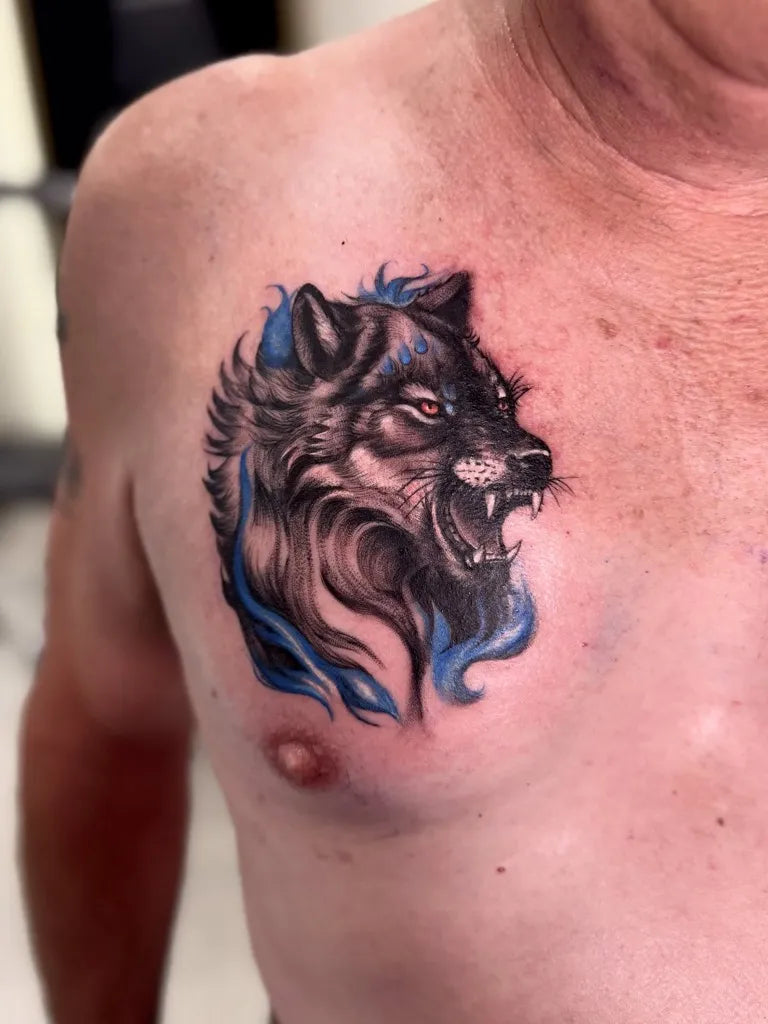 Medium Black and Grey Wolf Head on Men Chest Tattoo by @misscherrybombtattoos