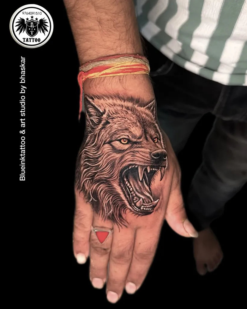 Medium Black and Grey Wolf on Men Hand Tattoo by @blueinktat2