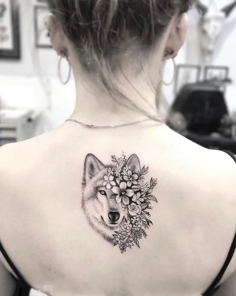 Medium Black and Grey Wolf with Flowers on Women Back Tattoo by @callyjoart