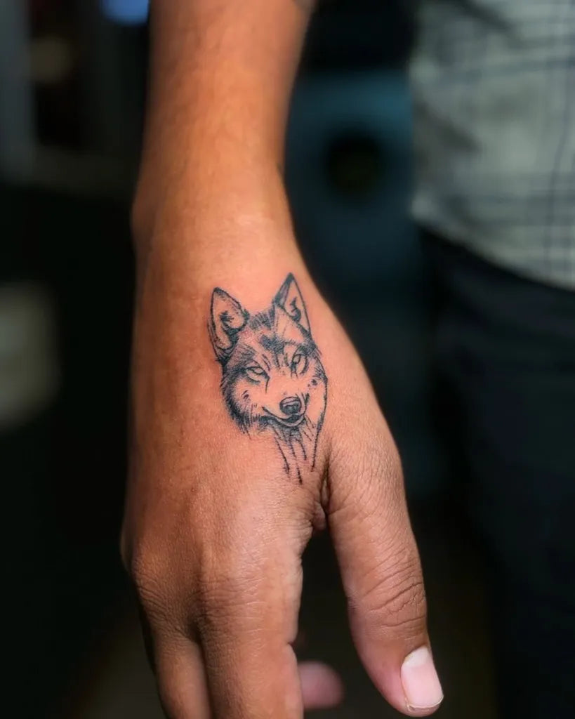 Small Black and Grey Wolf Head on Men Hand Tattoo by @bio_tattoos