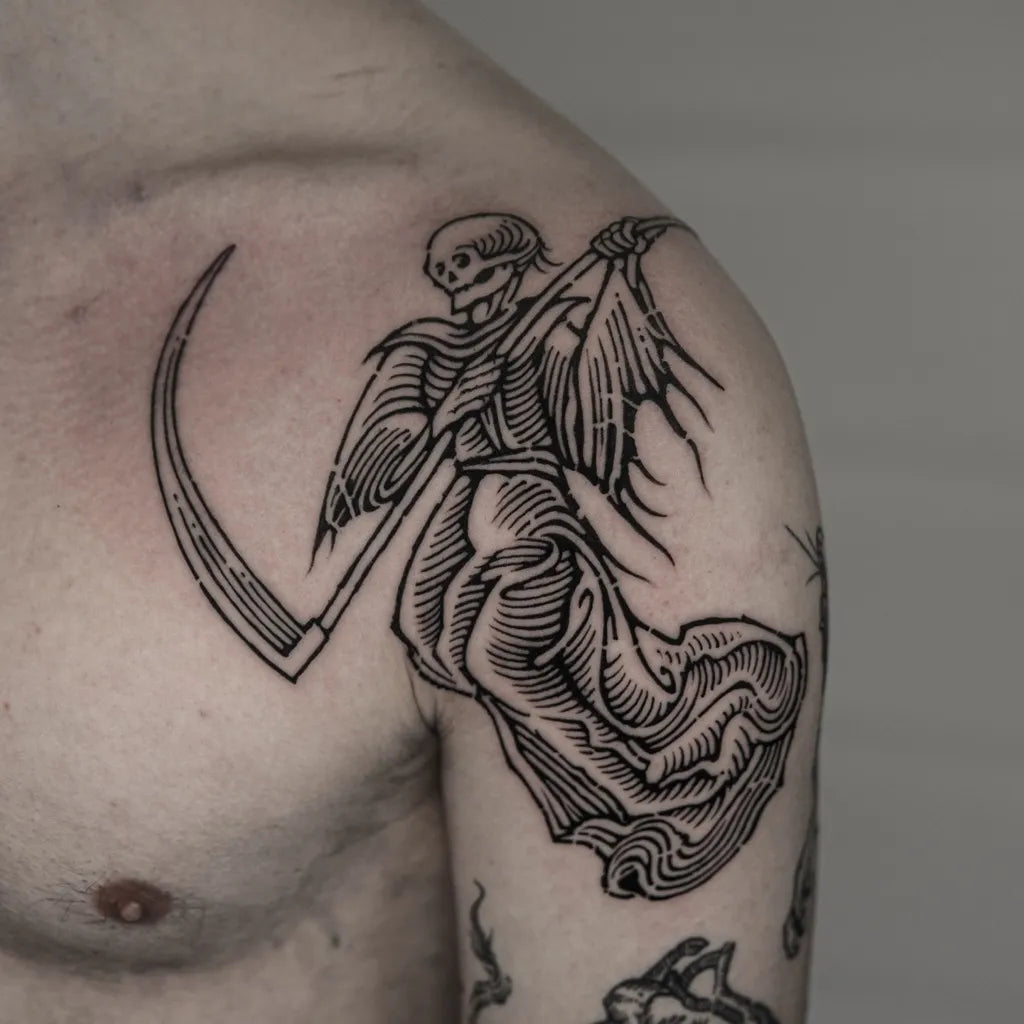 A woodcut tattoo is a tattoo style inspired by traditional woodcut and linocut printmaking, characterized by bold, high-contrast designs that mimic carved blocks and inked impressions. Instead of smooth gradients, a woodcut tattoo uses heavy black fills, stark highlights, and directional linework—like gouge marks—to create texture, depth, and dramatic storytelling. If you love vintage book illustrations, medieval engravings, or expressionist prints, a woodcut tattoo delivers that handcrafted, graphic look on skin.
