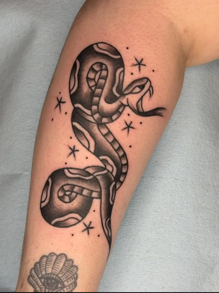 Big American Traditional Coiled Snake with Stars on Women Arm Tattoo by @blacksquirrelomaha