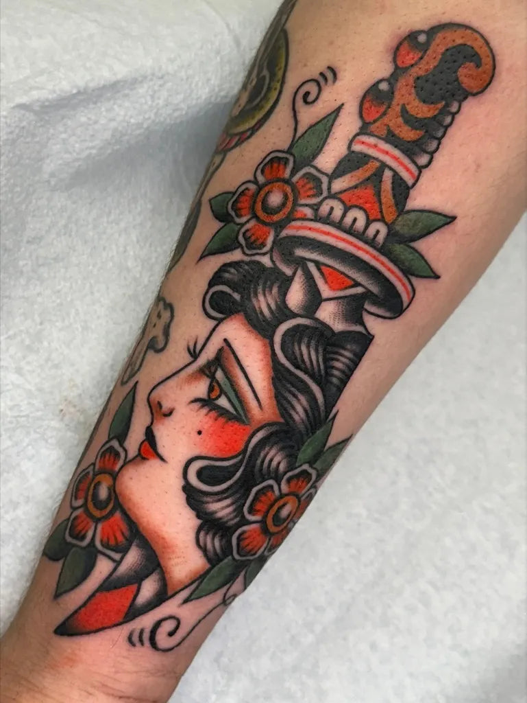 Big American Traditional Dagger with Pinup Girl and Flowers on Women Arm Tattoo by @charlie.rufino