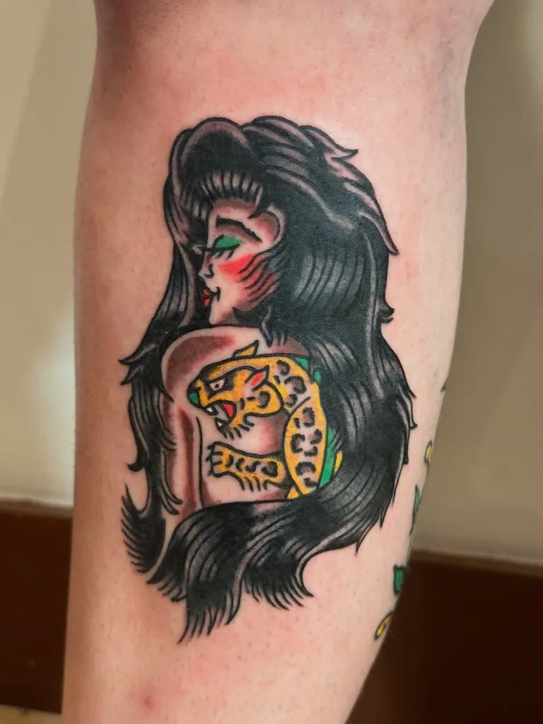 Big American Traditional Pinup Woman with Leopard Print and Heart on Women Arm Tattoo by @plattstatts