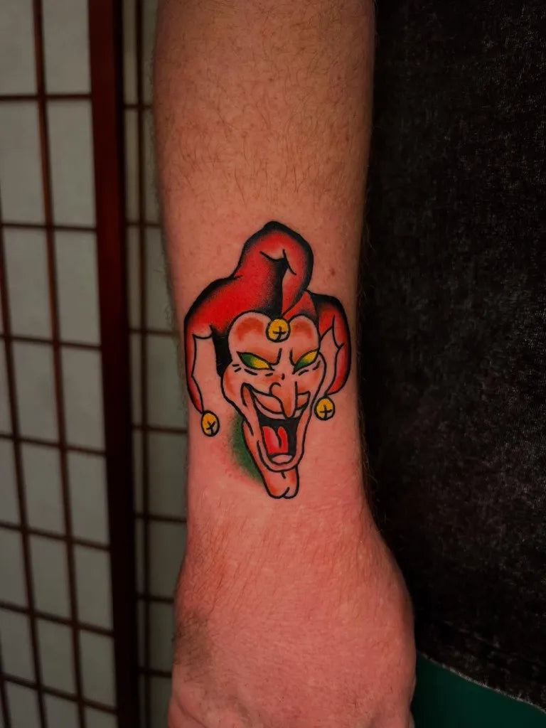 Small American Traditional Jester Mask on Men Wrist Tattoo by @attila_tatts