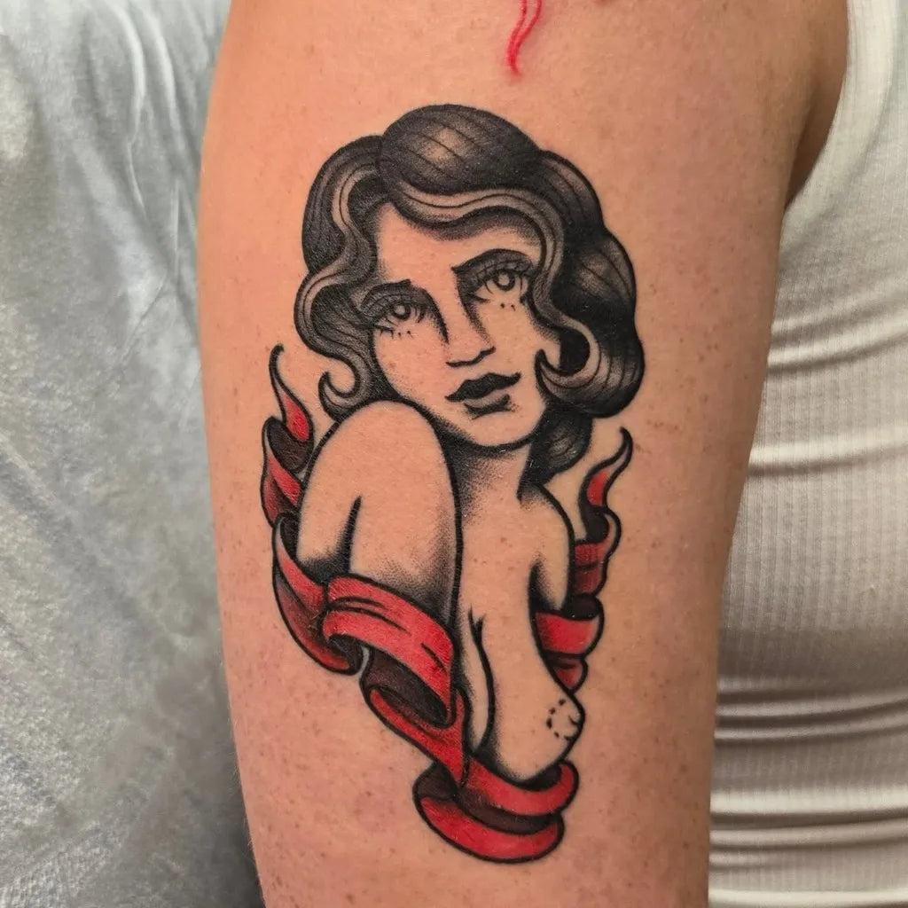 Small American Traditional Pinup girl with flames and ribbons on Women Arm Tattoo by @lucas_buckley_tattoos