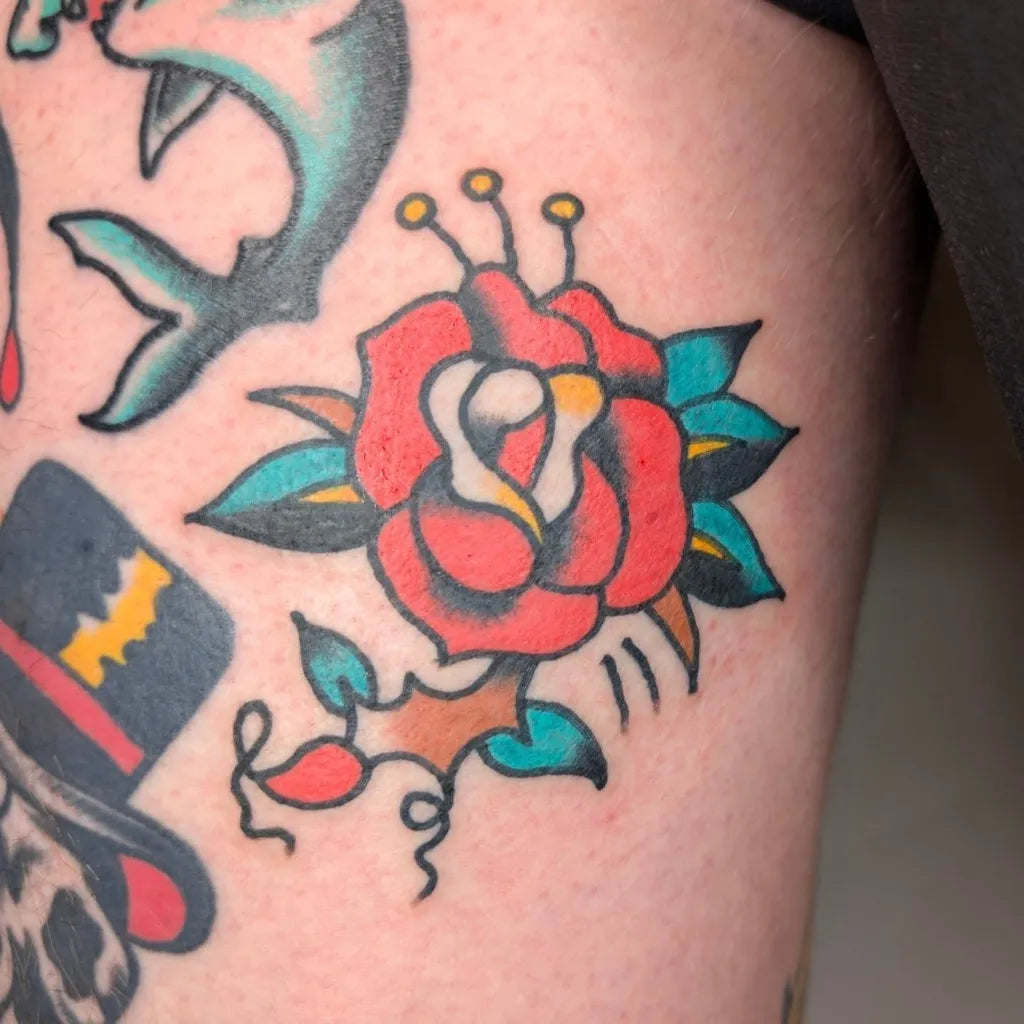 Small American Traditional Shark Rose Top Hat on Men Arm Tattoo by @markus.farewell
