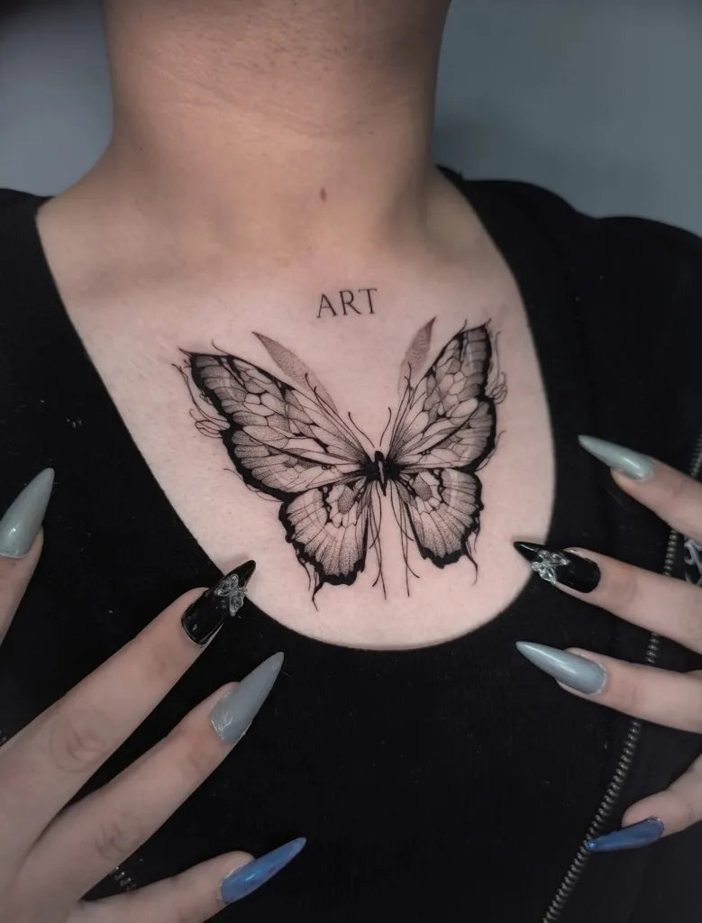 Blackwork Butterfly and Lettering on Women Chest Tattoo by @pintoranonimo.tts