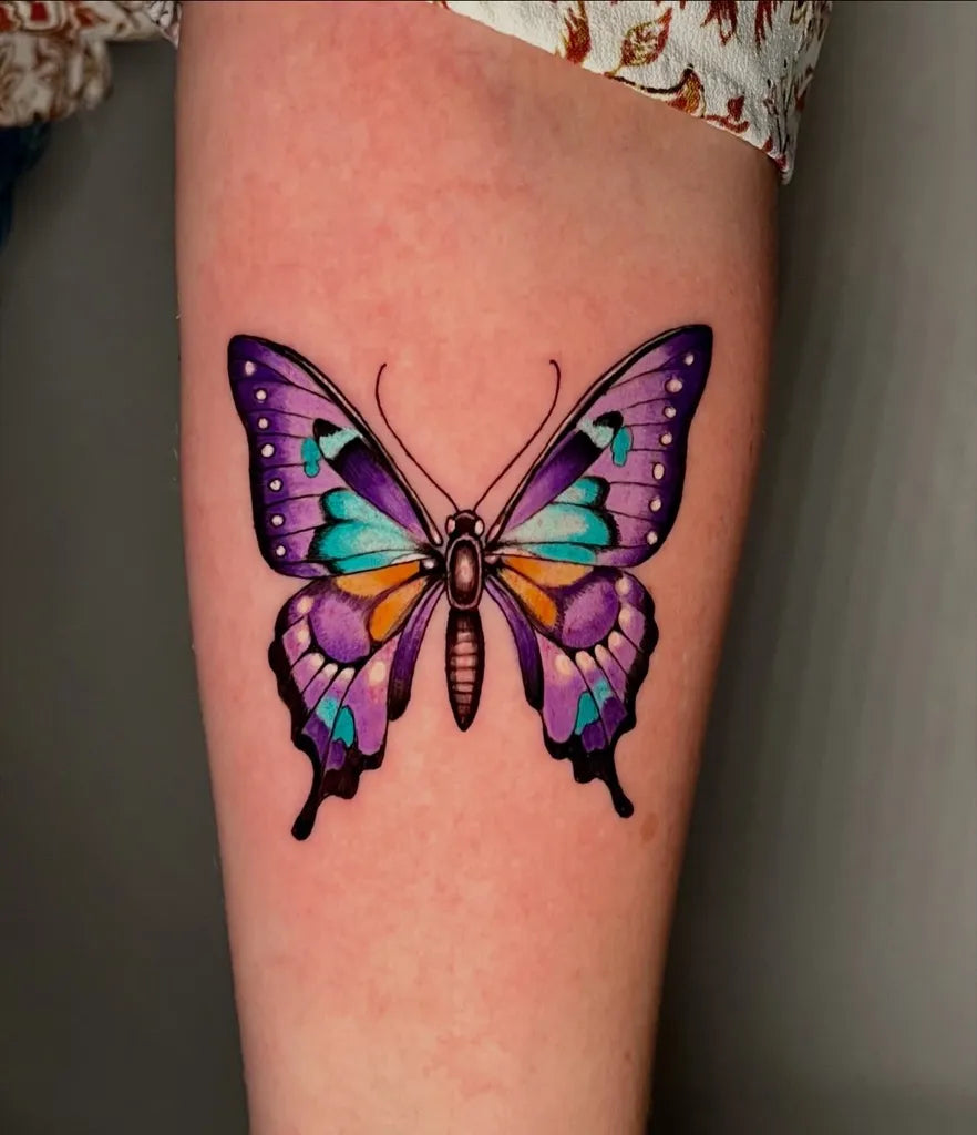 Colorful Butterfly on Women Arm Tattoo by @joibaileytattoos