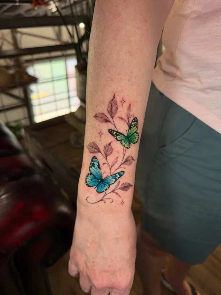 Watercolor Butterfly on Women Forearm Tattoo by @gracie.tattooer