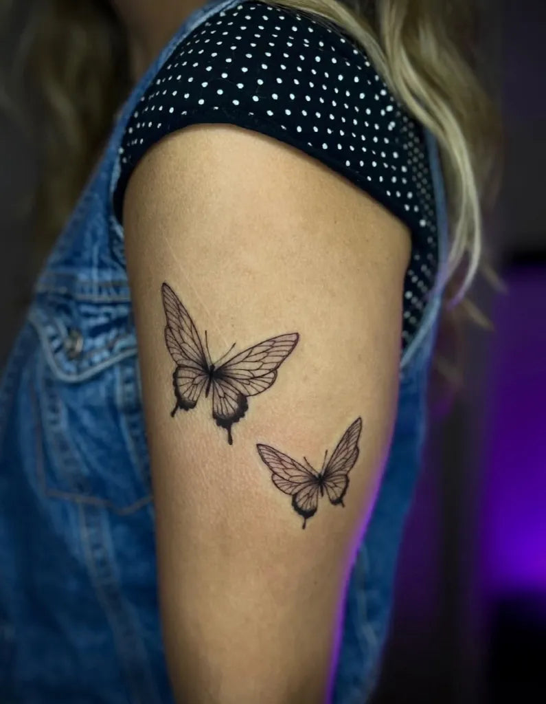 Small Fine Line Two Butterflies on Women Upper Arm Tattoo by @amandanicole_ink