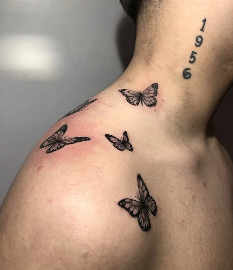 Small Fine Line Butterflies and Numbers on Men Shoulder Tattoo by @savashi222