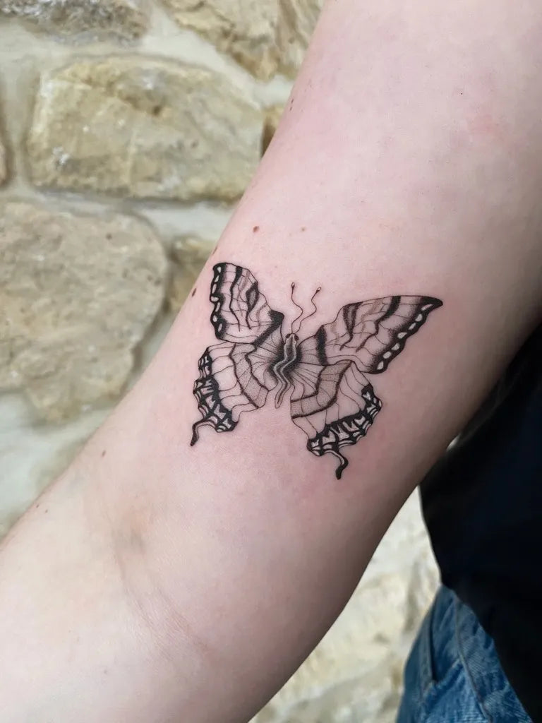 Surrealism Butterfly on Women Upper Arm Tattoo by @guncealtun
