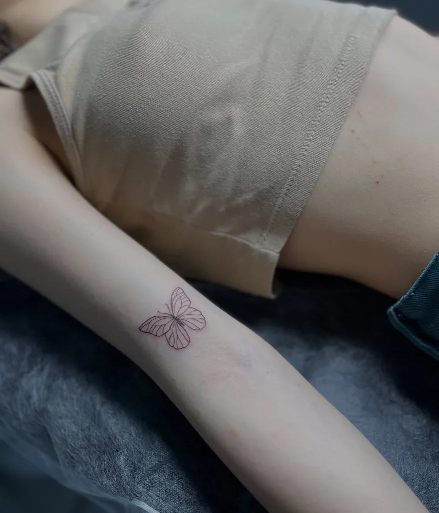 Small Fine Line Butterfly on Women Forearm Tattoo by @oldlondonroadtattoos