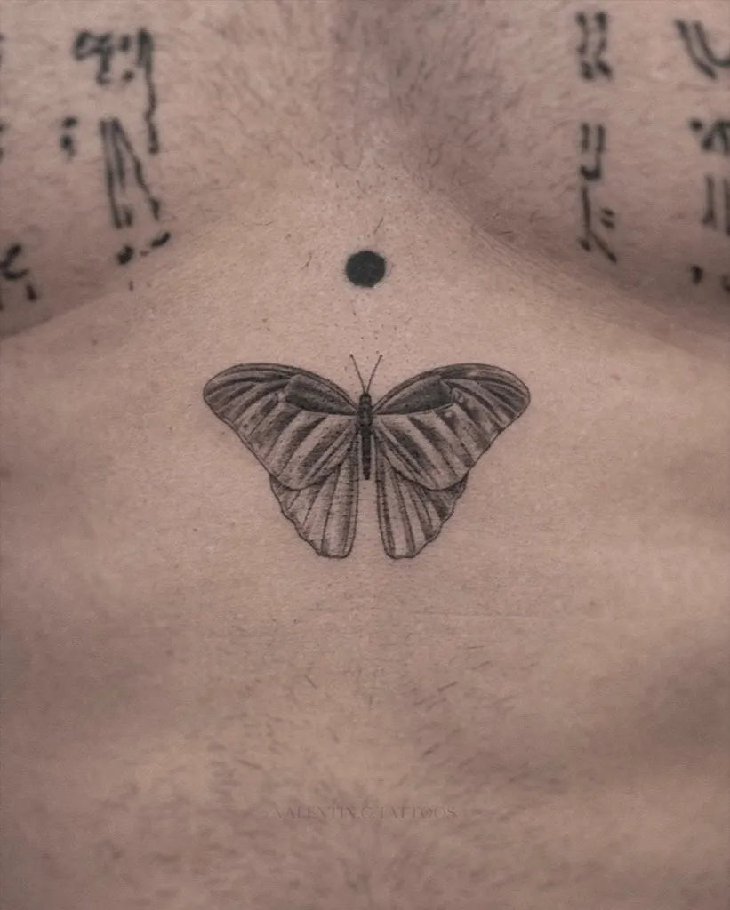 Small Minimalist Butterfly on Men Chest Tattoo by @valentin.c.tattoos