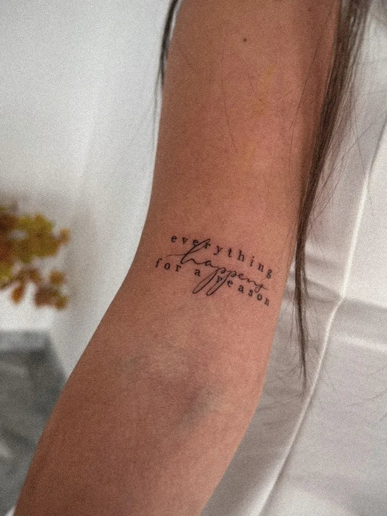 Small Fine Line Everything Happens for a Reason on Women Arm Tattoo by @tmibejca_art