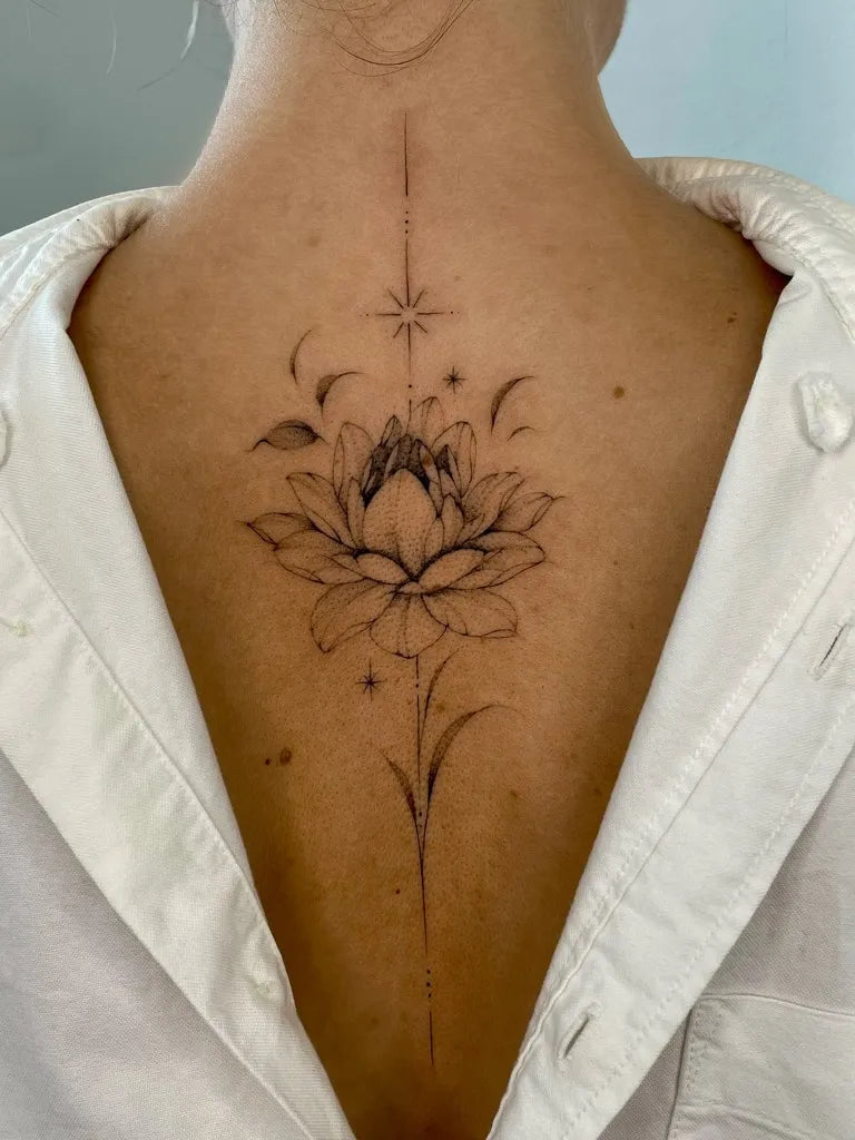 Small Fine Line Lotus Flower with Stars on Women Back Tattoo by @masterpiecesbymaria