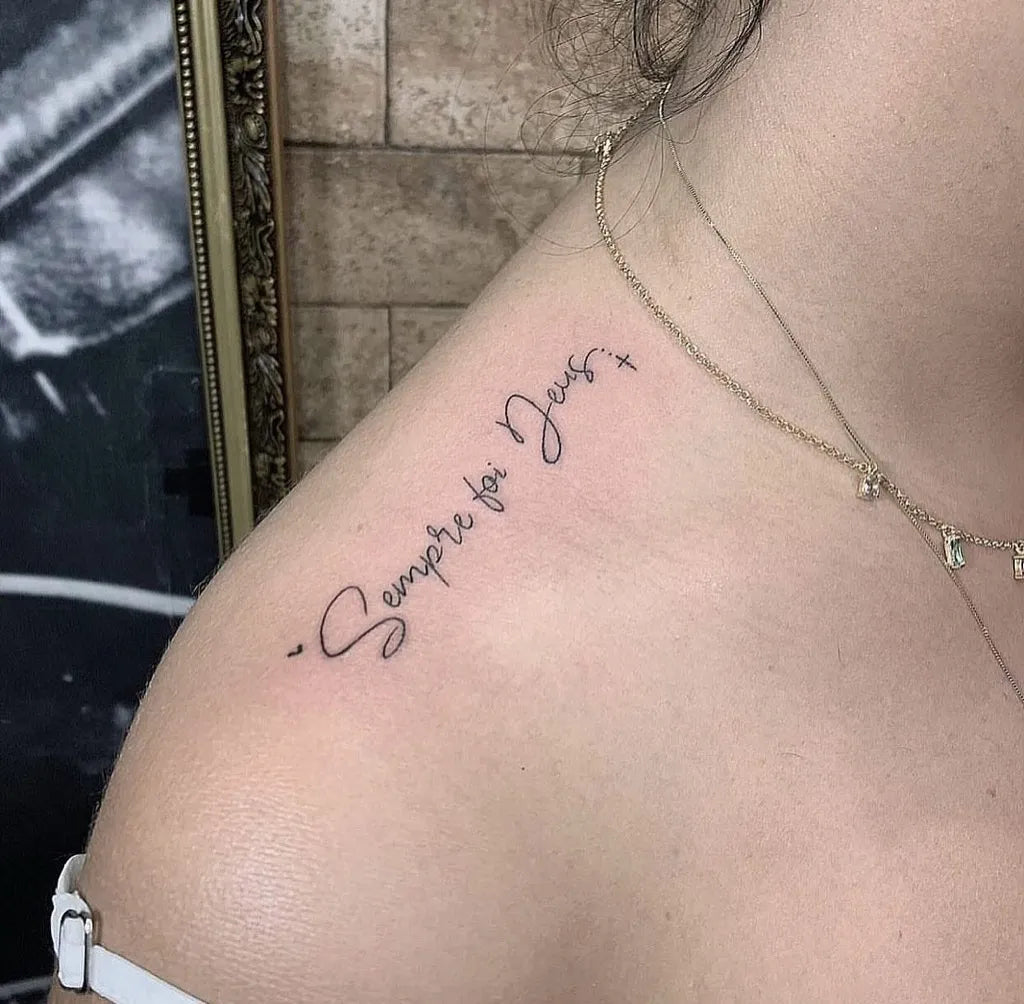 Small Fine Line Semper Fi Script on Women Shoulder Tattoo by @flaytattoo