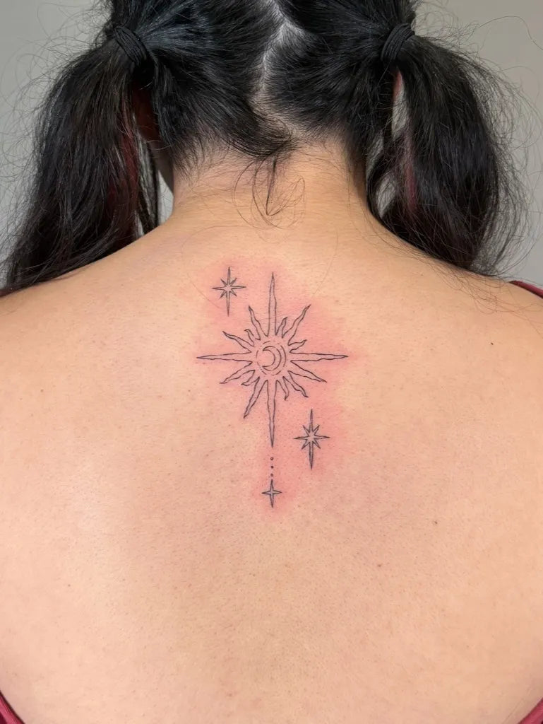 Small Fine Line Sun and Stars on Women Back Tattoo by @mu.uutat