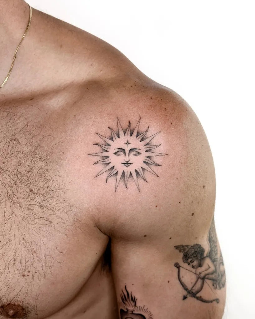 Small Fine Line Sun with Face on Men Shoulder Tattoo by @alexlloydtattoo