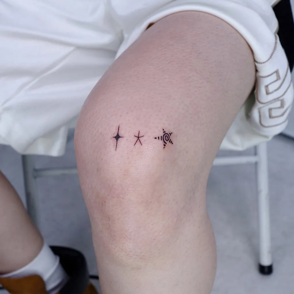 Tiny Fine Line three stars on Women Knee Tattoo by @tattooist_dulgi