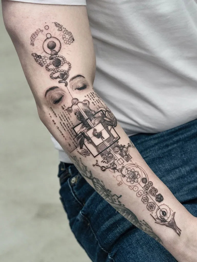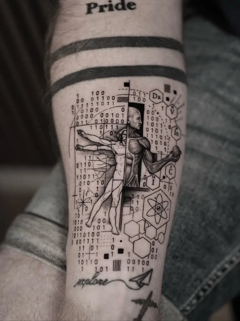 Big Geometric Vitruvian Man Binary Code Atom on Men Arm Tattoo by @tt.mink